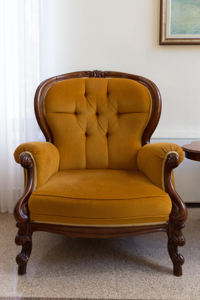 Fauteuil ancien remis en valeur, parfait pour créer un coin lecture cosy au charme délicieusement rétro.
